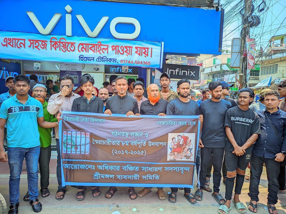 On Thursday (May 8) at noon, under the banner of the deprived general members of the Sreemangal Traders’ Association, an unusual protest program was held at the Sreemangal Choumuhona Square. The banner read slogans such as “Long live autocratic leaders, eternal be despotism” and mentioned the “Eighth Anniversary of Constitutional Violation and Autocracy (2017–2025).”