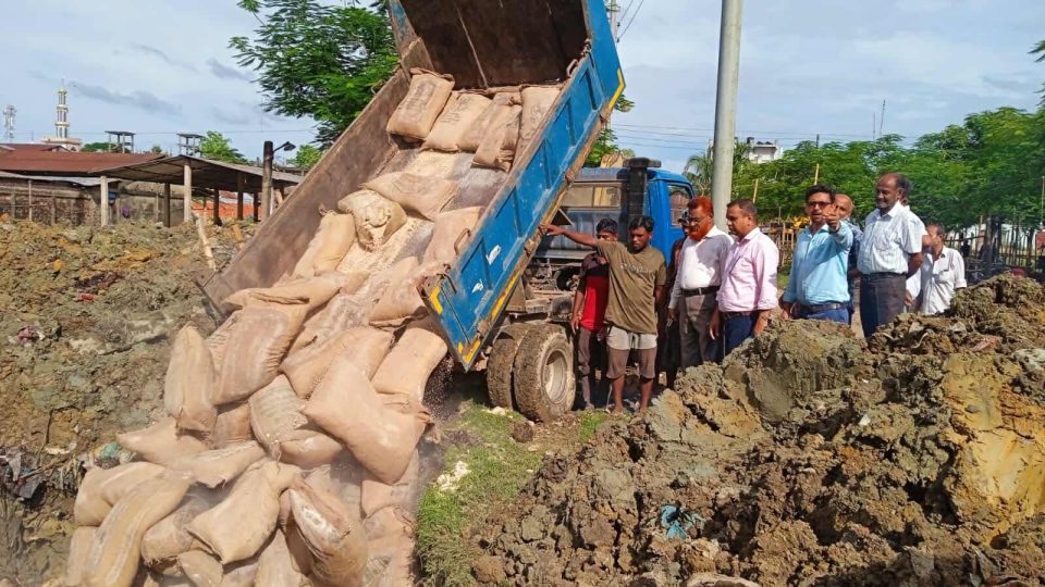 According to relevant sources, the district administration allocated about 31 metric tons (1027 sacks) of VGF rice to Baralekha Municipality for distribution among the poor ahead of the holy Eid-ul-Azha on June 7. The rice was lifted from the food godown on May 29 and kept in the municipality hall. Although preparations were made to start the distribution from June 2, on May 31, the municipality office was submerged in 3-4 feet of water due to flash floods and mountain streams. Along with other damages, 234 bags of VGF rice got wet and spoiled, making the distribution unusable. The rice was rotting and emitting a foul smell. Finally, the municipality authorities buried the rice in the abandoned area of the municipality’s cattle market on Sunday afternoon.