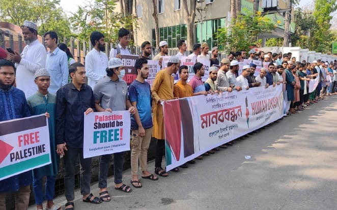 Bangladesh Islami Chhatra Shibir Sylhet Metropolitan Branch organized a protest and human chain in the capital, condemning the indiscriminate killing of Palestinians by Israeli forces in Gaza and demanding the establishment of an independent Palestinian state. During the program, they called for a boycott of all Israeli products.