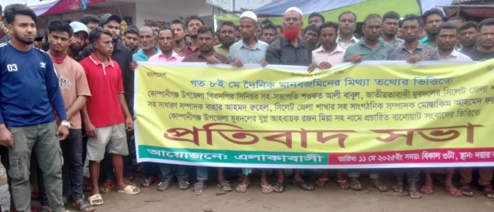 The speakers at the protest meeting said that false propaganda is being spread against Companiganj Upazila BNP Senior Vice President Shawkat Ali Babul and Sylhet District Jubo Dal Joint General Secretary Ruhel Ahmed Bahar, District Jubo Dal Joint Organizing Secretary Mostakin Ahmed Farhad and Companiganj Upazila Jubo Dal Joint Convener Rajan Mia. They also said that the locals are extremely angry and shocked against the propaganda being spread with this false and fabricated information in various ways. Such propaganda is false, fabricated, baseless, purposefully motivated and imaginary. The locals said that a vested interest group is running such propaganda to achieve their interests.