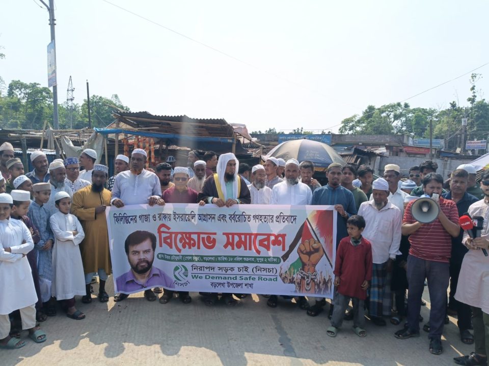 Ashfaq Ahmed, Borolekha-Juri Correspondent: A protest rally was held on Friday (April 18) after Jummah prayers at the Uttar Choumuhoni roundabout in Borolekha municipality, Moulvibazar. The rally was organized by the Borolekha Upazila branch of the national social-volunteer organization “Nirapad Sarak Chai” (NISCHA) in protest against the brutal attacks and genocide by Israel in Palestine.