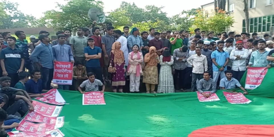 The protesters staged a sit-in and demonstration in front of the Sylhet Central Shaheed Minar on Saturday at 3 PM.